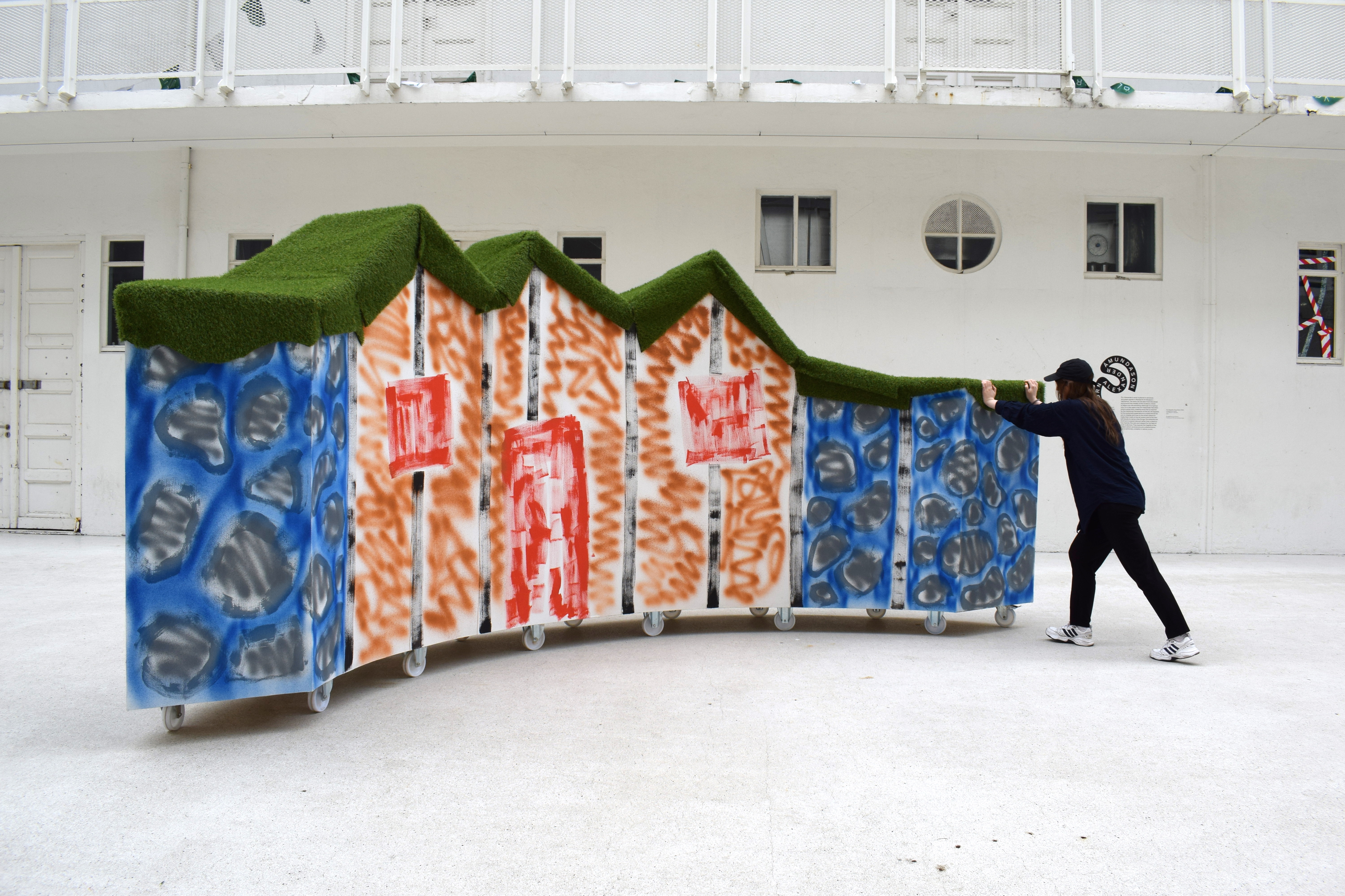 Eva’s work explores the cultural heritage of the nation. She puts forward the classic Icelandic turf house, or more accurately, the image of the classic farm. It has wooden gable ends which face the front. The wooden gable turf house was only temporary; it appeared in the 18th century, became very popular in the 19th and gradually disappeared in the 20th. Today it lives as part of the collective memory in Iceland when people try to imagine life in the olden days. The drawing that Eva used as base for the work came to her by a complete coincidence, hidden in between pages in a book she bought in the flea market. The picture that the artist draws of the turf house deals with definitions of memory, where do memories come from and how are they created? The work is on wheels and is therefore mobile, here she creates with a primitive sincerity the connection between our body and the world of the mind. The idea of the turf house becomes a toy, a carousel, or a stage set. The turf house travels round and round depicting or unraveling somewhat of a memory functions.